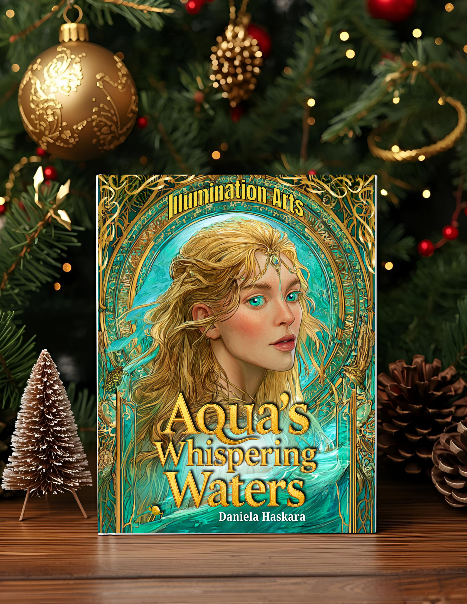 Book titled 'Aquas Whispering Waters' by Daniela Haskara displayed in front of a decorated Christmas tree with ornaments, small Christmas trees, and pinecones.